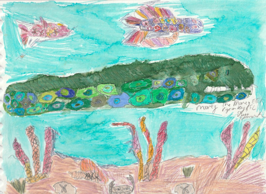 My name is Erica Edmondson. I am majoring in Health Information Management. I currently live in Wisconsin; but, I am originally from Florida. My mixed media artwork ” Moorey the Morey Eel” was inspired by a Marine Biology class trip to the Fl Keys. I discovered Moorey in an abandoned water pipe under the dock on Pigeon Key. He bobbed his head in and out of the pipe looking for food. Dr. Ken Thomas took his picture and Moorey now has legal protection because Pigeon Key is located in a marine wildlife sanctuary area. I received scientific credit for his discovery and the picture taken of him. Moorey’s picture was also featured in the Diver’s Guide to the Fl Keys.